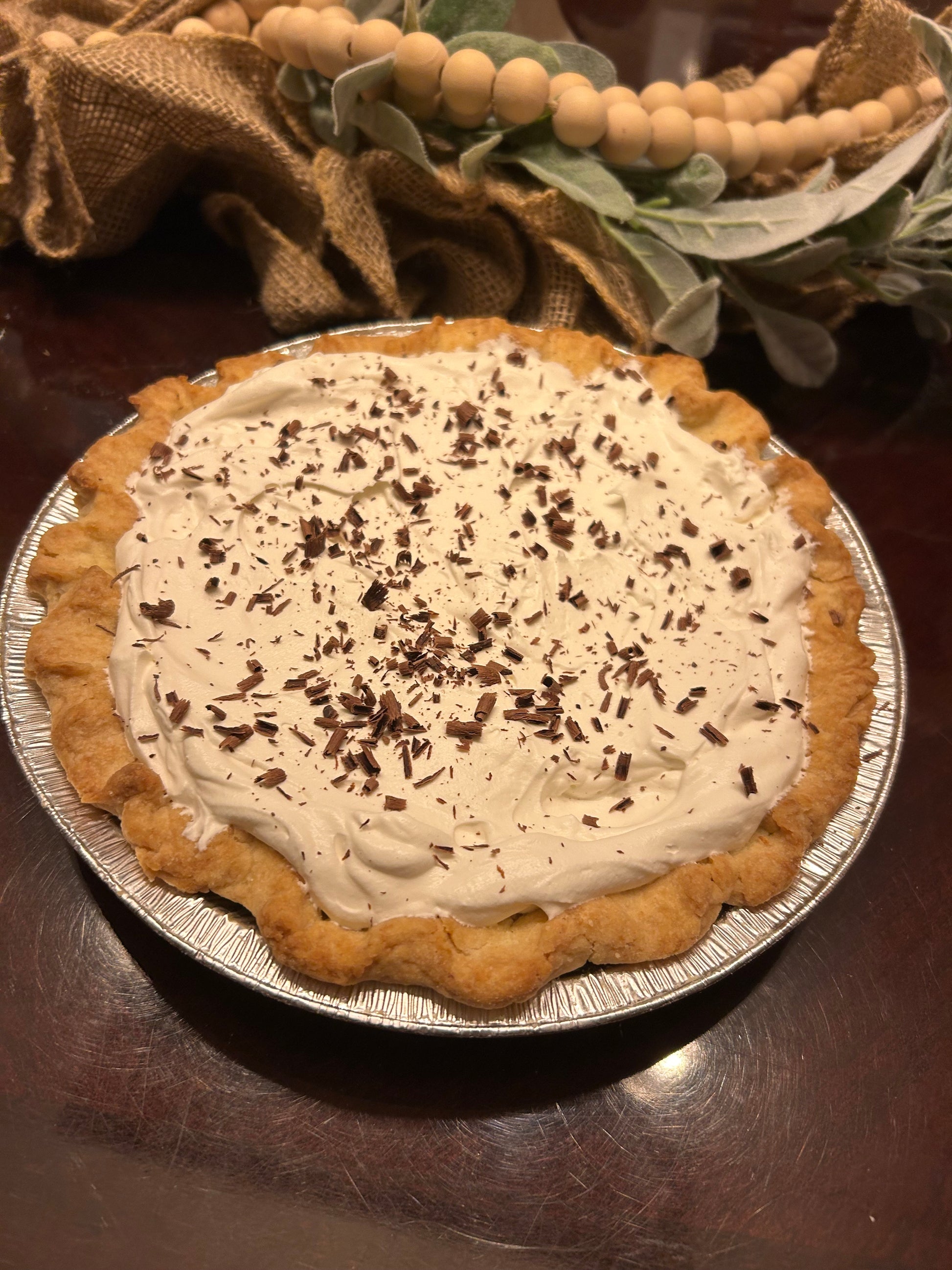 Silky dark chocolate filling in a flaky pie crust topped with whipped cream.