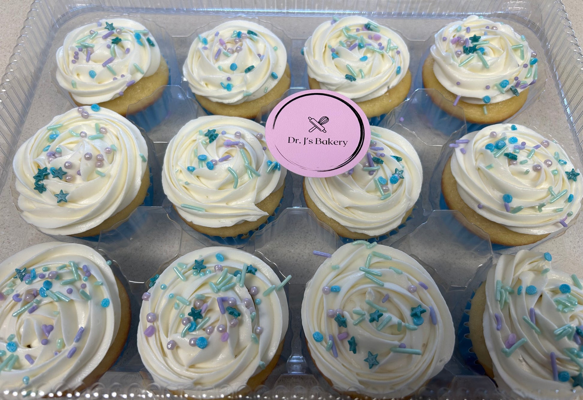 Classic cupcakes with rosettes, star swirls, or smooth swirls Swiss meringue buttercream frosting. Sold by the dozen.
